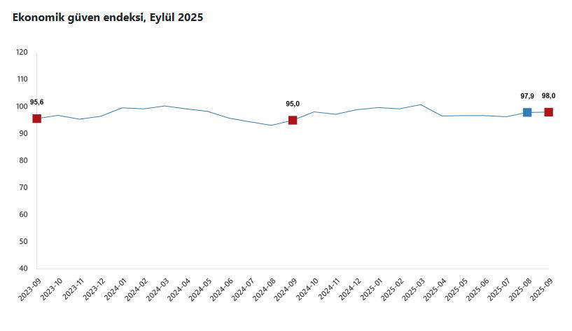 TÜİK’in açıkladığı verilere göre; ekonomik güven endeksi eylül ayında bir önceki aya göre yüzde 0,1 oranında artarak 98 değerini aldı.